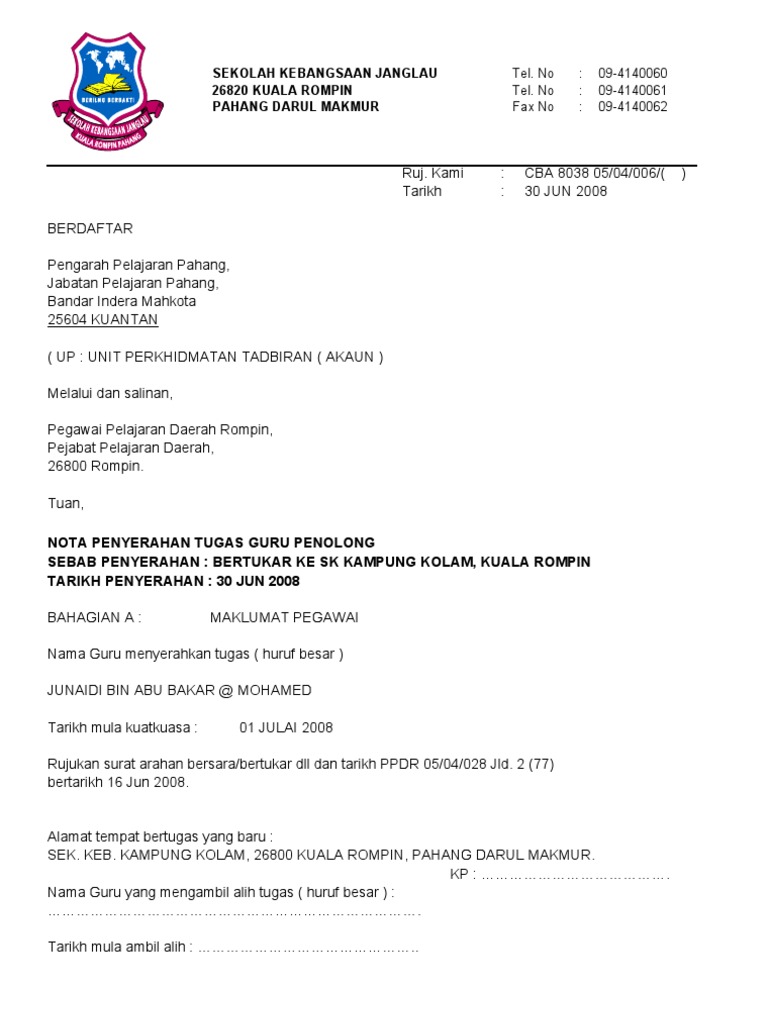 Senarai hartabenda / peralatan kolej 5. Surat serahan tugas ~ borang nota serah tugas untuk pertukaran 1 docx lampiran a format nota serah tugas kandungan perkara muka surat 1 surat penyerahan dan akuan terima course hero. Berita acara serah terima barang. Nampaknya, kali ini ramai guru yang berjaya dalam permohonan. Surat rasmi serah tugas surat ras mp3 & mp4.